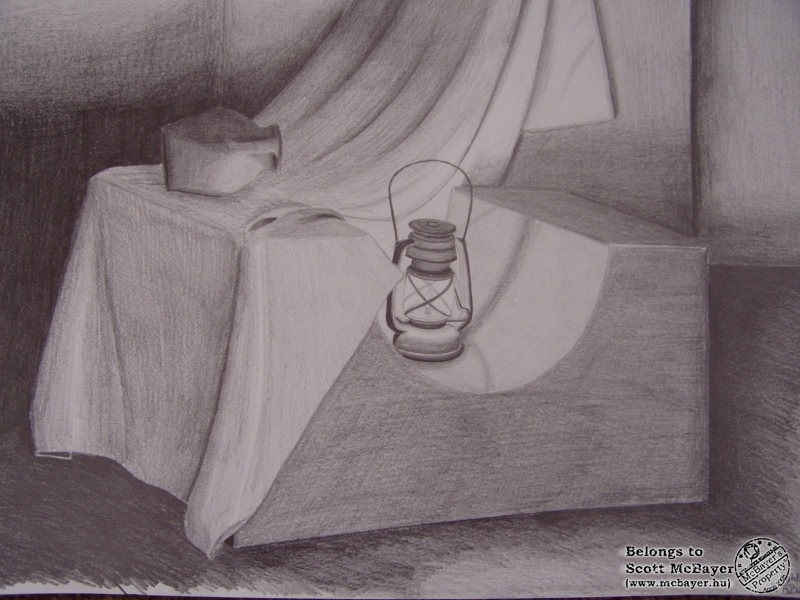Egy egész jóra sikerült alkotás, melyben igyekeztem az óra alatt egy jó kompozíciót összeállítani. Valamint utána próbáltam némi sejtelmes fényt beleiktatni, mivel a lámpa nem égett, ez a félig a fantázia szüleménye.