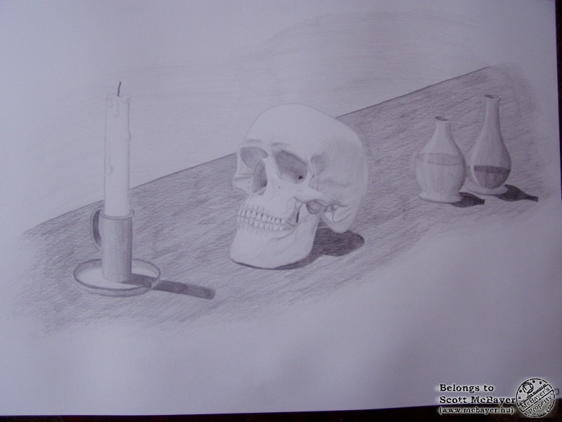 Koponya, gyertya, üvegcsék... hm, mintha valami középkori kémikus asztala lenne.